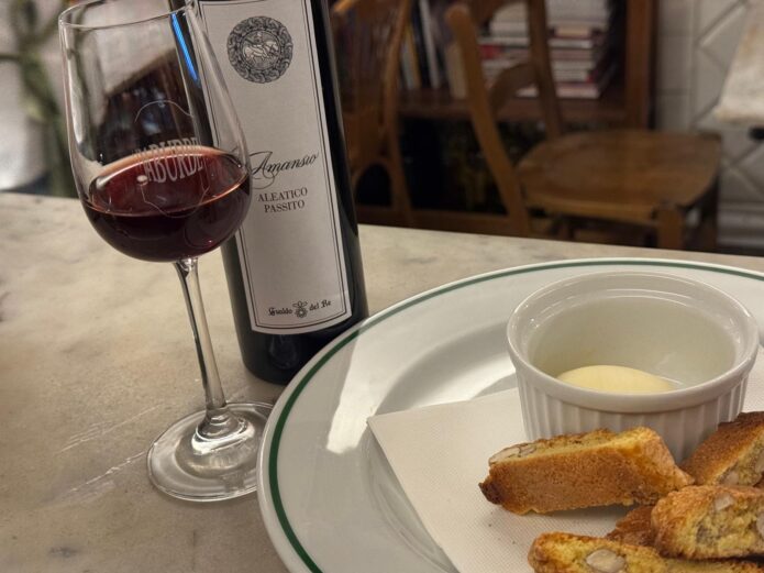 L’Aleatico è un vitigno aromatico primario, come il Moscato e il Brachetto: dà note intense di frutta rossa, viola, mammola, prugna, amarena, ribes, con sfumature di rosa, cuoio, liquirizia e — quello che mi piace di più — mandorla. Ed è proprio questa nota di mandorla che ci ha fatto pensare al cantucci: un morso di biscotto di Prato con questo vino è davvero bello. Immaginate lo stesso vino con delle mandorle tostate accanto. Non è dietetico, ma è inverno, e in fondo un po’ ci vuole.
