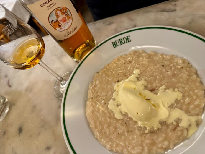 Un risotto del genere di solito si abbina più facilmente a un rosso di medio corpo che a un bianco, che fa un po’ fatica. Ma con l’aggiunta della dolcezza si riesce ad andare oltre — un po’ come quando si mette una confettura d’arance su un formaggio stagionato: quella nota di agrume candito che sentite nel vino fa esattamente lo stesso lavoro. I passiti, in generale, possono sostituire le confetture negli abbinamenti con i formaggi o nei piatti a base di formaggio. Ci pensate, la prossima volta.