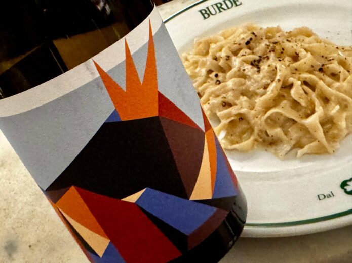 Questo invece è un prototipo molto molto interessante di vino. Lo avevamo servito con la trippa; ora col cinghiale fa un po’ fatica, ci vogliono vini più strutturati — adesso vi chiederemo o vi portiamo un altro bicchiere, perché vi versiamo anche la Barbera che ha la struttura per stare dietro al cinghiale. E invece questo è un vino rosso molto moderno in realtà, un vino vulcanico, quindi su suolo vulcanico. Che vuol dire? Ha una componente salina — non è necessariamente che i vini sul vulcano sono salati, però di sicuro hanno un diverso mix a livello di contenuto. Pensate all’acqua, no? Tutte le acque più buone vengono fuori da qualche vulcano — la Ferrarelle, eccetera — insomma, le fonti hanno proprio una diversa composizione chimica. E chiaramente il vino, che è composto per l’83-86% da acqua, è ovvio che se l’acqua è particolarmente buona e ricca, ha un sapore particolare.