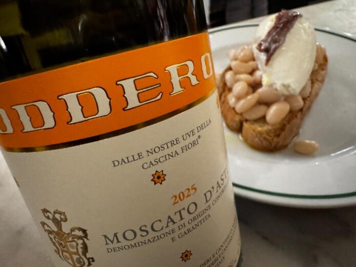 Nel piatto avete, dal punto di vista fisico, la grassezza del fagiolo che ha bisogno di una bollicina per pulire il palato — e avete sentito come questo Moscato faccia esattamente questo. Dal punto di vista evocativo, invece, l’acciuga rimanda al Piemonte, forse la regione che storicamente consuma più acciughe: basta pensare alla bagna cauda, alle storie dei barili in cui si trafugava il sale nascondendolo sotto le acciughe, ai vari bagnetti tipici della tradizione. Un rimando al territorio, dunque, che si sposa naturalmente con la bollicina piemontese.