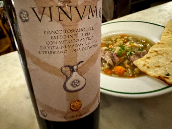 E quelle sono ricette che lui non si è inventato: sono ricette che ha trovato diciamo in qualche testo — etrusco non ci sono, però insomma i Romani dicevano che gli Etruschi facevano così. Ma anche Plinio il Vecchio raccontava che si faceva in questo modo il vino. Dopodiché l’ha invecchiato in botte di castagno. La sua idea era di farlo in anfora, però comunque le anfore — sapete che i Romani in realtà le anfore non le usavano per la vinificazione, cioè le usavano per trasportarlo, ma non le usavano per la vinificazione. La vinificazione in anfora è una cosa che ci siamo inventati ora: le anfore che usiamo non hanno niente a che fare con quelle antiche. Cioè, abbiamo preso un’anfora che serviva per il trasporto e il concetto l’abbiamo trasformato in un vaso vinario. Ma il vaso vinario-anfora di cui si parla — appunto parlando della Georgia — sono grandissime anfore interrate, grosse più o meno come metà di questa stanza, e non hanno niente a che vedere con quelle che trovate nelle cantine oggi. Però insomma, tutto fa marketing e brodo, verrebbe da dire visto quello che avete in tavola.