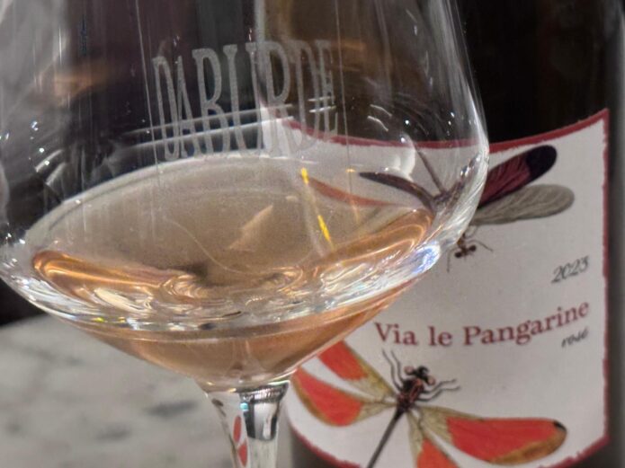 Pinot Grigio ramato delle terre alte di Pietramala 2023. Un bellissimo colore ambrato-grigio-ramato – chiamatelo come volete – ma effettivamente è il classico del Pinot Grigio ramato. Naso sfaccettato e variegato con note di melograno, tabacco, frutta di bosco, foglie secche, erbe aromatiche di montagna, ginepro e una speziatura particolare che è tipica del Pinot Grigio, qui elevata a un’intensità notevole grazie alla grande freschezza. Sorso di intensità, spessore e anche un discreto corpo ne fanno un vino davvero da tutto pasto. Da noi ottimo anche sui pizzoccheri alle castagne del Mugello con il formaggio del caseificio Bacciotti e i marroni di Simone Menichetti.