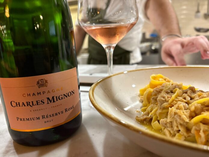 Un componente piccola ma non indifferente di pinot nero vinificato in rosso AOC Champagne rende questo Premium Reserve Rosè di Charles Mignon un rosa da non sottovalutare nella sua apparente semplicità. Al naso è melograno, fragole, rose e ribes rosso e nero con sfumature di tabacco, olive, tostatura leggera di caffè, ritorni balsamici di alloro e mentuccia. Ma è in bocca che si rivela davvero intrigante con struttura vinosa che al naso veniva ben mascherata dal resto e dall’intensità del floreale e fruttato. Sensazioni saline ne costellano il sorso e il dosaggio generoso (per la media attuale) lo rende ideale servito freddo sulla Panzanella di Seppia e sulle Tagliatelle all’acqua pazza e Scorfano di Eros Ghezzo in Palagina. Appena si scalda può essere l’ideale su una cartelletta al lampone oppure, nel nostro caso, su uno zuccotto fiorentino semifreddo dove duetta bene con i canditi…