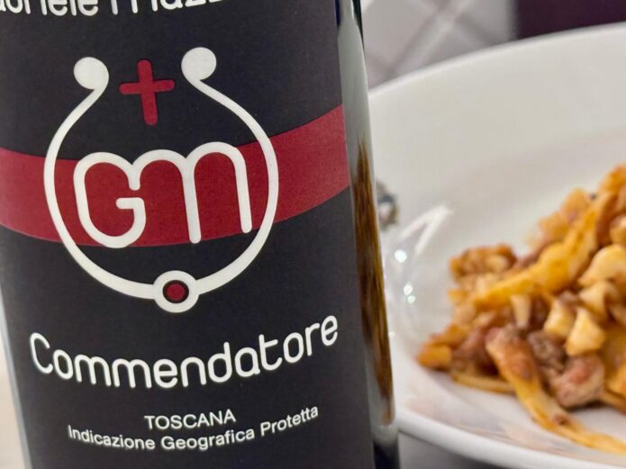 In bocca il vino conferma l’impressione: è fresco, scattante, quasi nervoso nel suo slancio giovanile. Meno denso rispetto ad altre versioni del Commendatore, ma per questo forse ancora più interessante: si muove rapido, snello, con una tensione dinamica che lo rende stimolante e vivo. Ha bisogno di un po’ di tempo in bottiglia per distendersi, certo, ma già ora regala un’idea chiara della sua natura: un figlio diretto, schietto e immediato del 2023, senza compromessi, senza maquillage. Curiosamente, si è rivelato sorprendente anche con piatti dalla spalla gustativa più ampia, come la pasta asciutta Fabbri con i “dentri” di Paolo Gori con note amarmognole quelle sfumature più ferrose, amaricanti, come fegato, radicchio o frattaglie delicate. È proprio in questi abbinamenti più audaci che la leggerezza del vino gioca di contrasto e pulizia, regalando un’esperienza meno convenzionale.